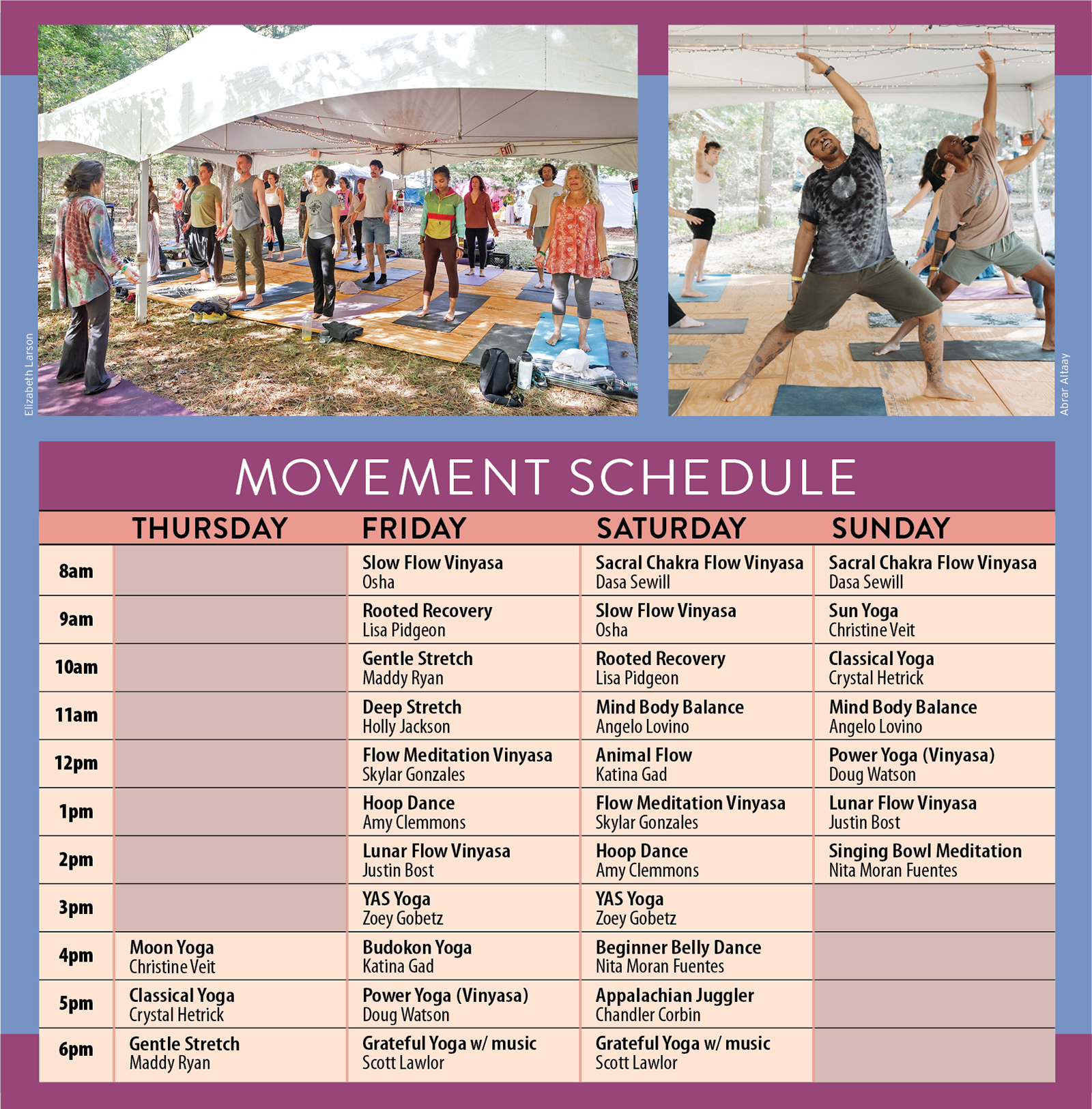 Yoga with Auditory Silliness: Release the frog in your throat through fun breathwork intertwined with asana flow to target those cranky spots in your body. Perfect for post Hootin’, Hollerin’ and Dancin’! Zoey Gobetz – Friday 3pm & Saturday 3pm